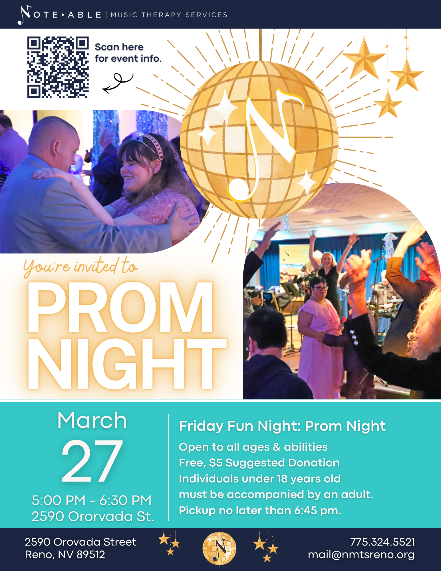 Join us at NMTS for our monthly Friday Fun Night, featuring NMTS Prom! Come dance, request your favorite songs, connect with community, express yourself, and have fun on the dance floor. Wear what makes you feel your best β from formal to funky β and celebrate a night of music, movement, and joy together. Free and open to all ages and abilities (under 18 must be accompanied by an adult; pickup no later than 6:45 PM). $5 suggested donation.